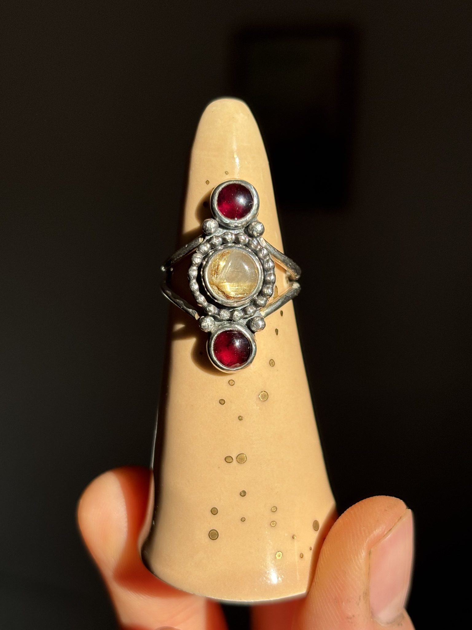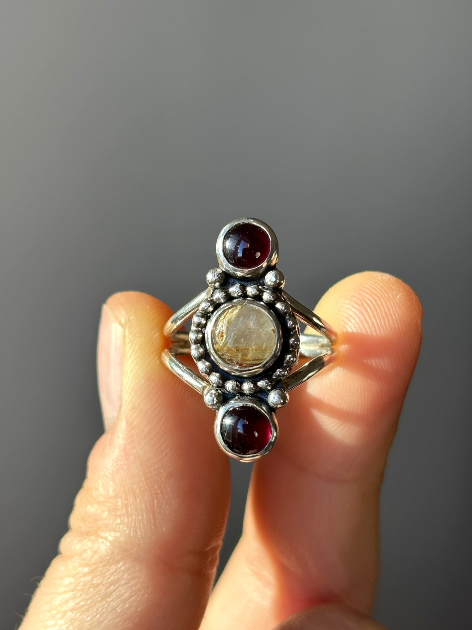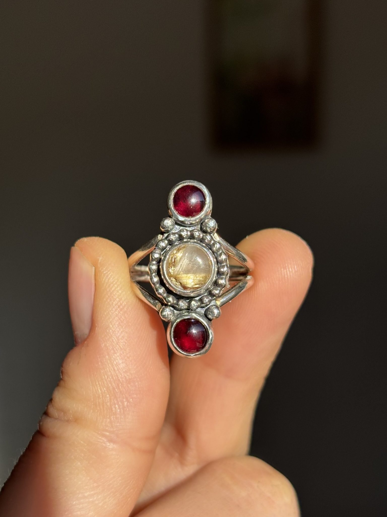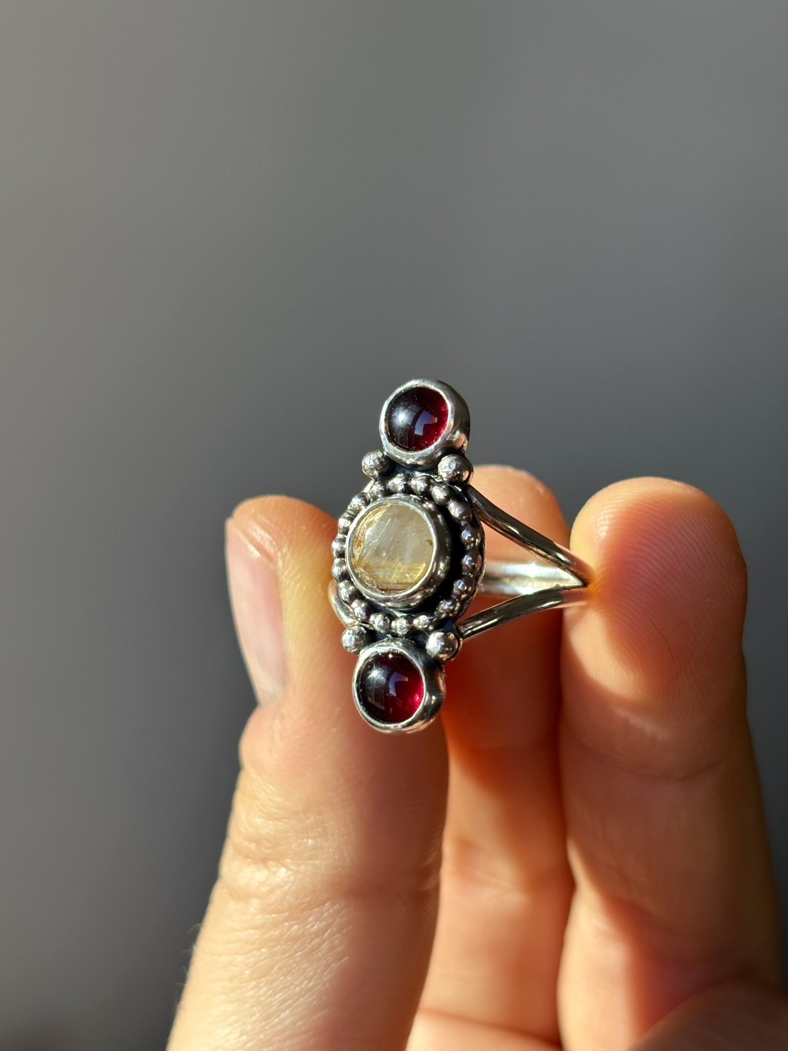 Anillo de plata de ley con cuarzo rutilado dorado y granates.