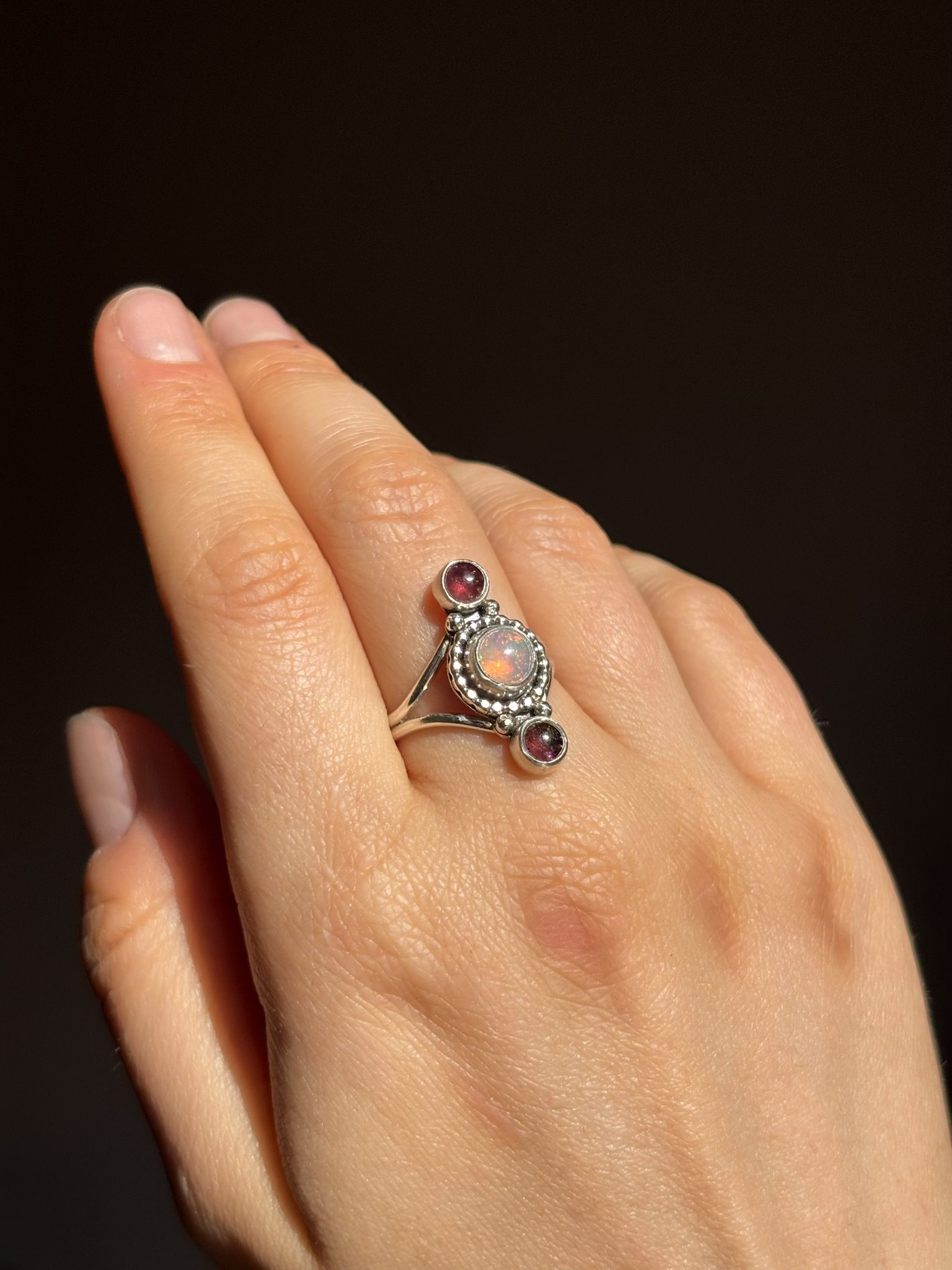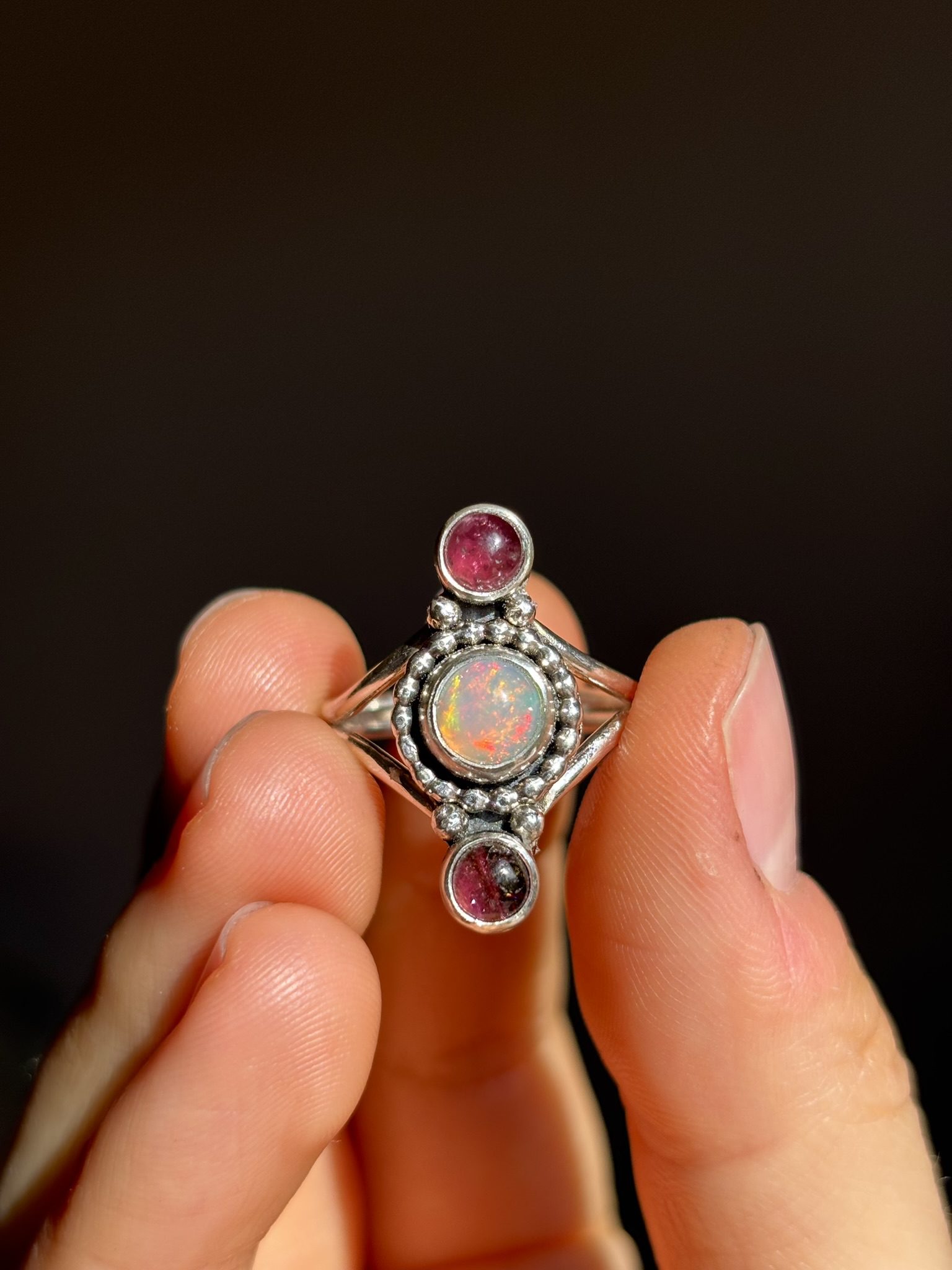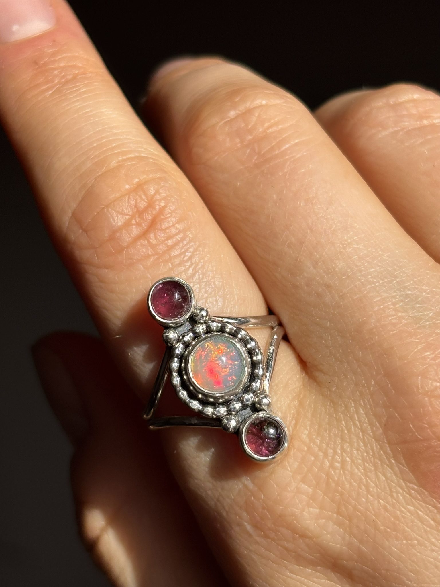 Anillo Gem elaborado en plata de ley con ópalo etíope de alta calidad y dos turmalinas rosas que combinan con los brillos del ópalo.