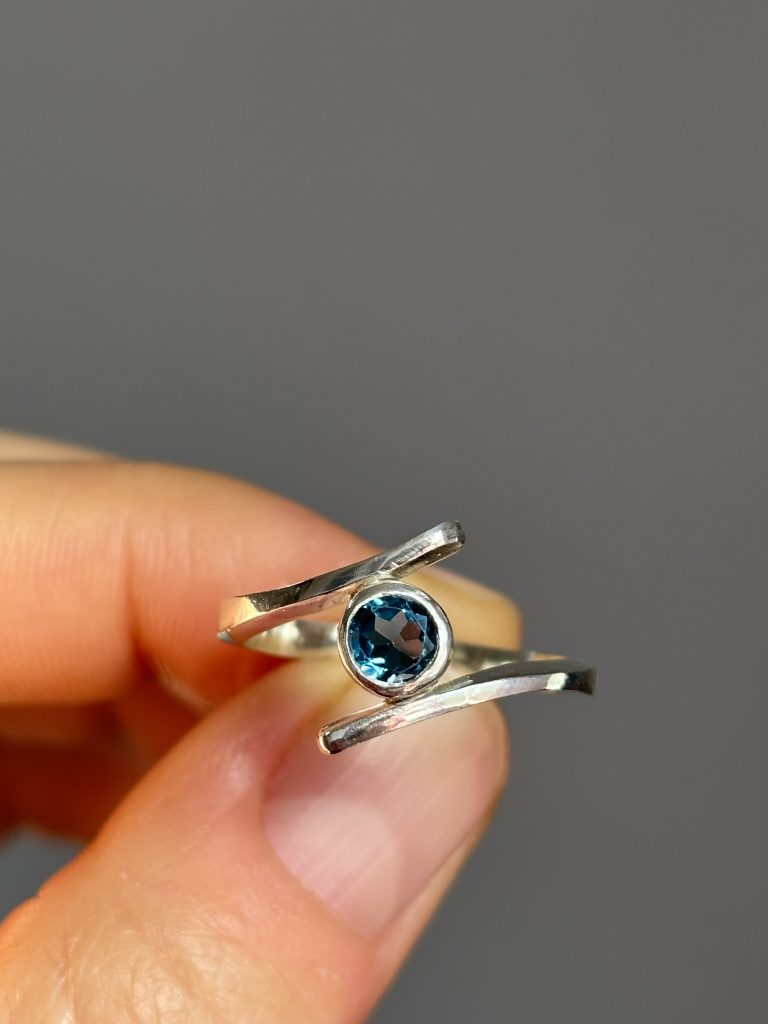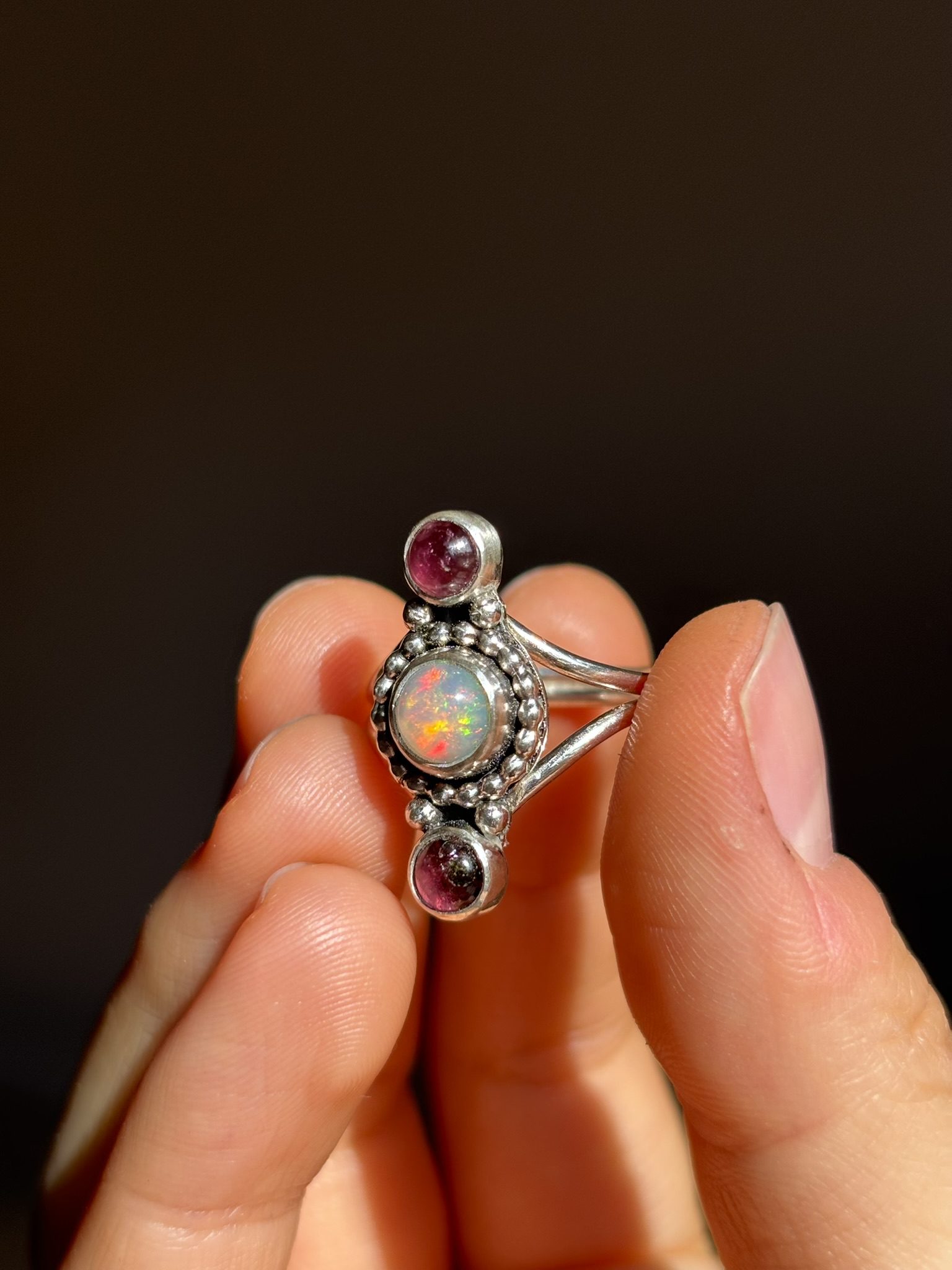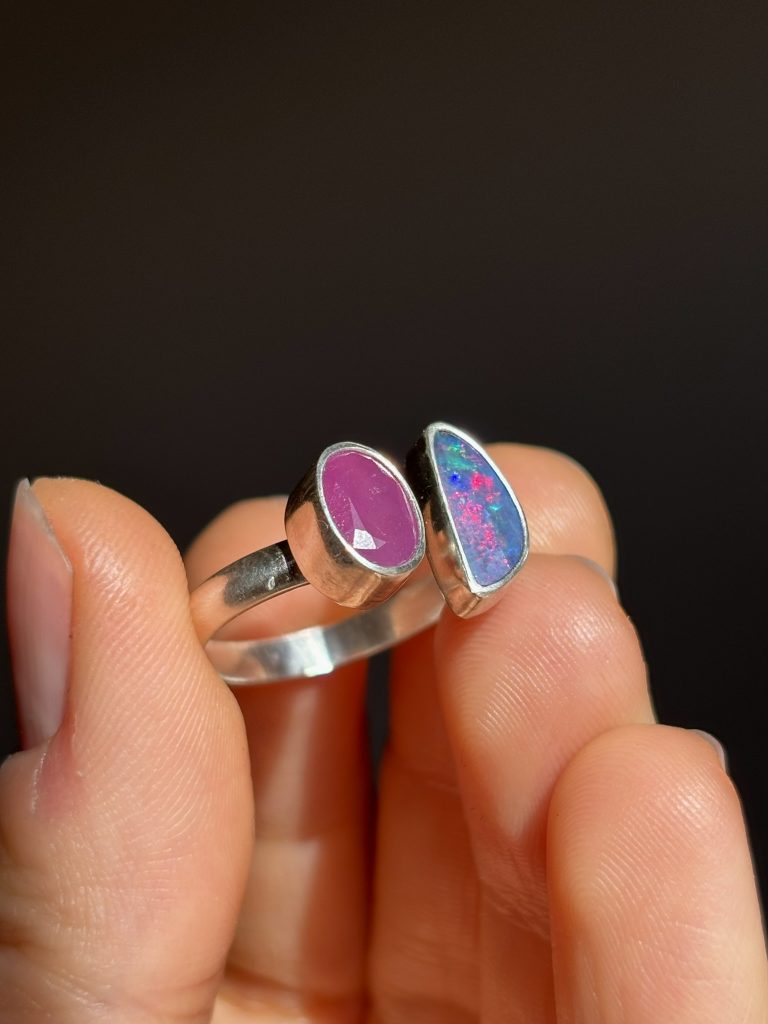 Anillo Gem elaborado en plata de ley con ópalo etíope de alta calidad y dos turmalinas rosas que combinan con los brillos del ópalo.