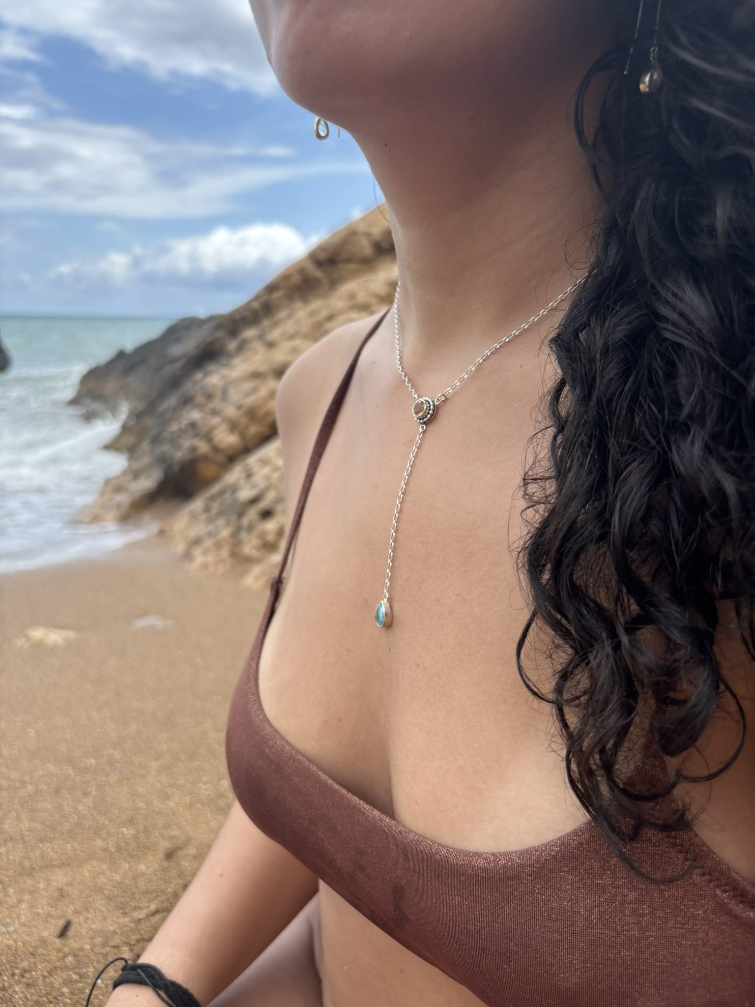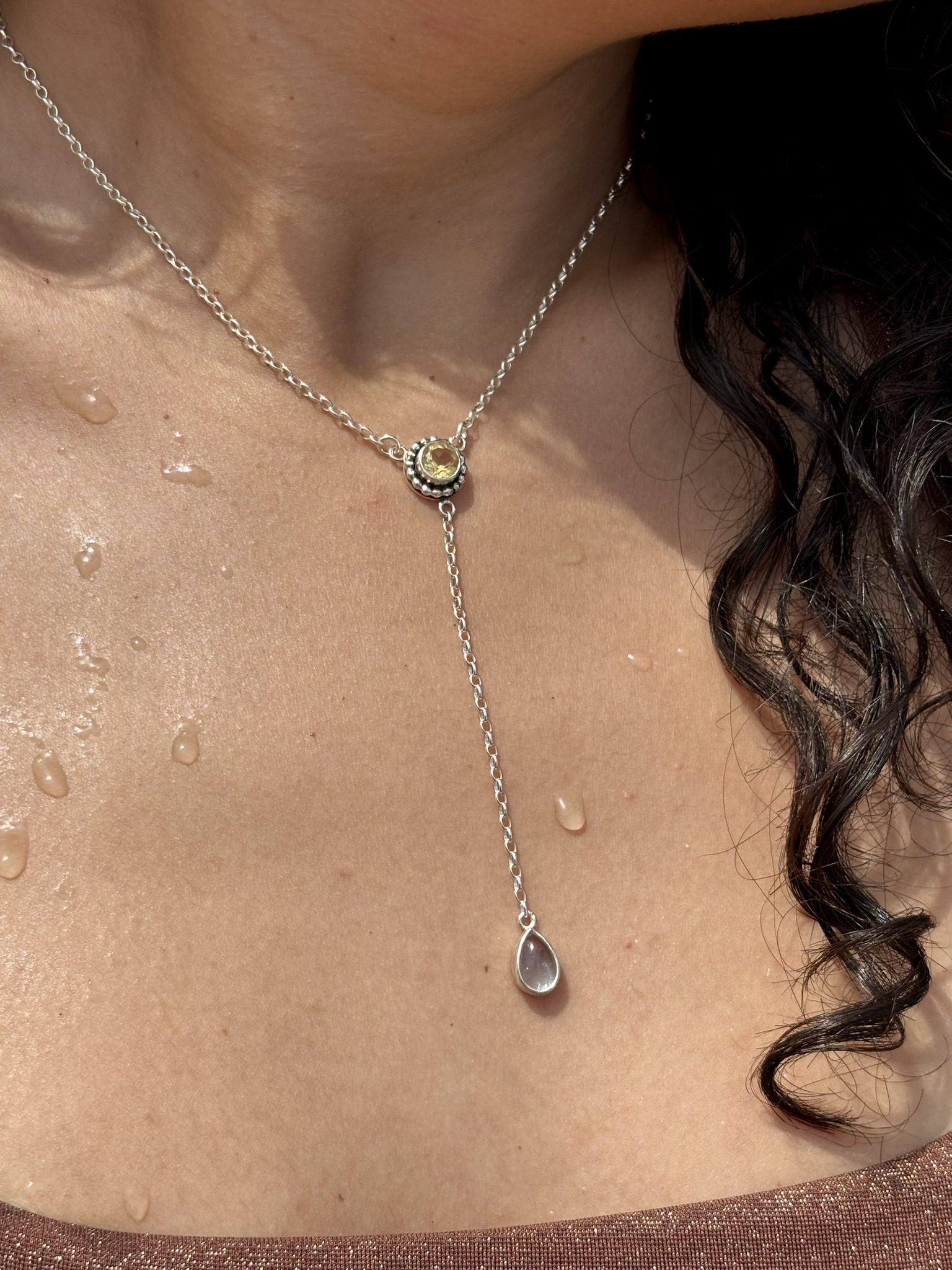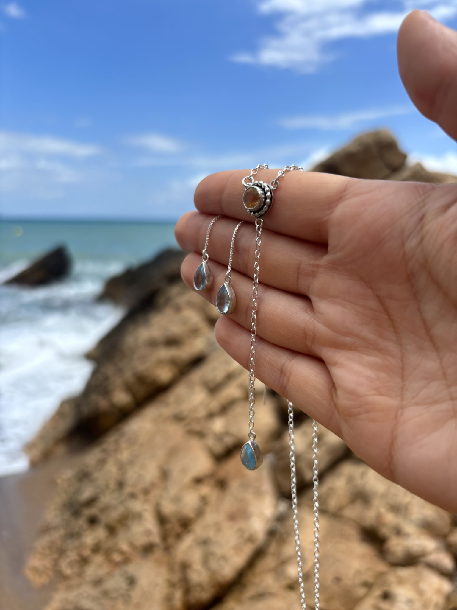 En el centro, un citrino facetado brilla como un rayo dorado, mientras una gota de topacio azul cuelga sutilmente, recordando la frescura cristalina de las olas. Elaborado en plata 925, este collar es una joya ligera, luminosa y llena de vida, perfecta para llevar el verano siempre contigo.