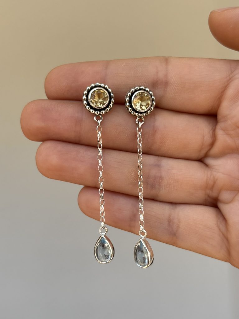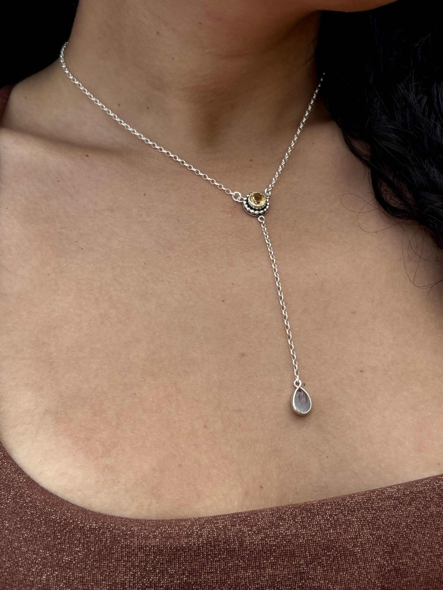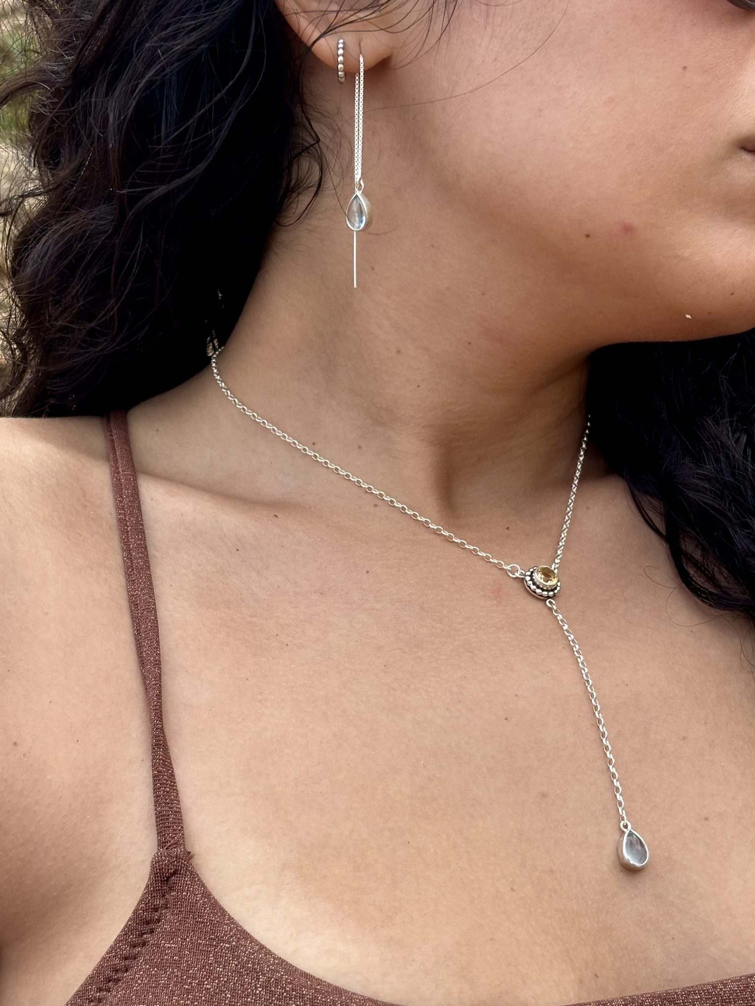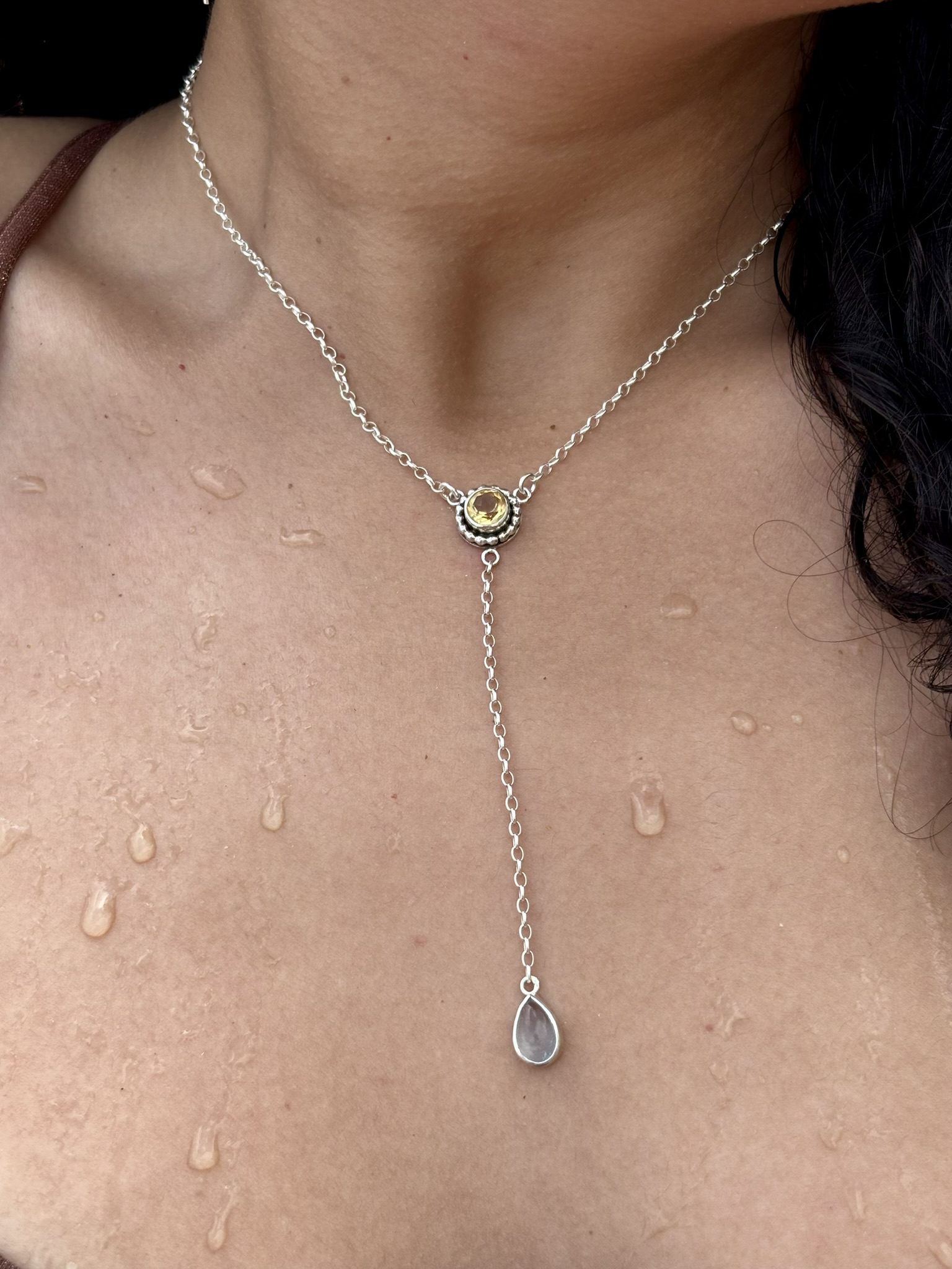 En el centro, un citrino facetado brilla como un rayo dorado, mientras una gota de topacio azul cuelga sutilmente, recordando la frescura cristalina de las olas. Elaborado en plata 925, este collar es una joya ligera, luminosa y llena de vida, perfecta para llevar el verano siempre contigo.