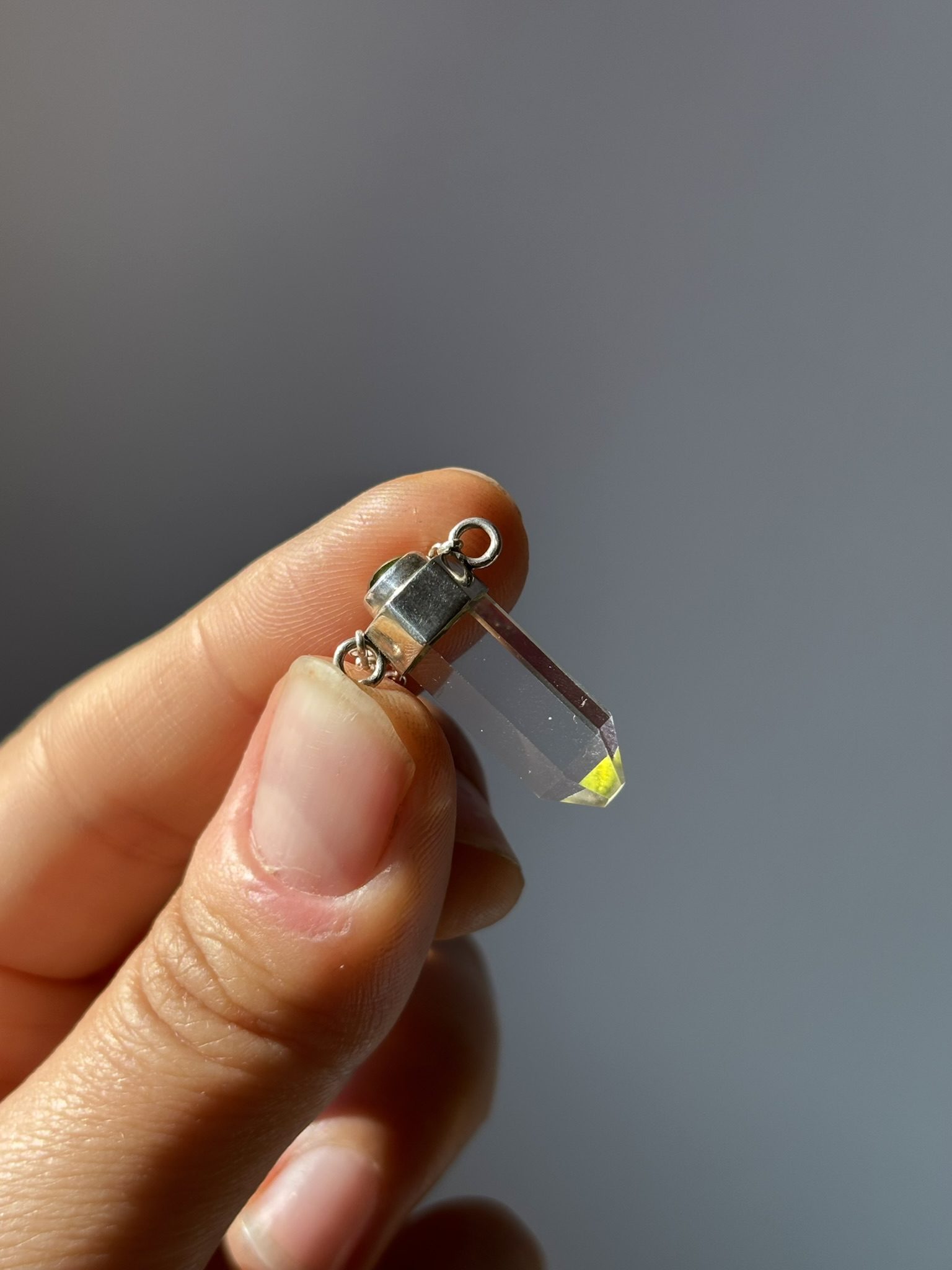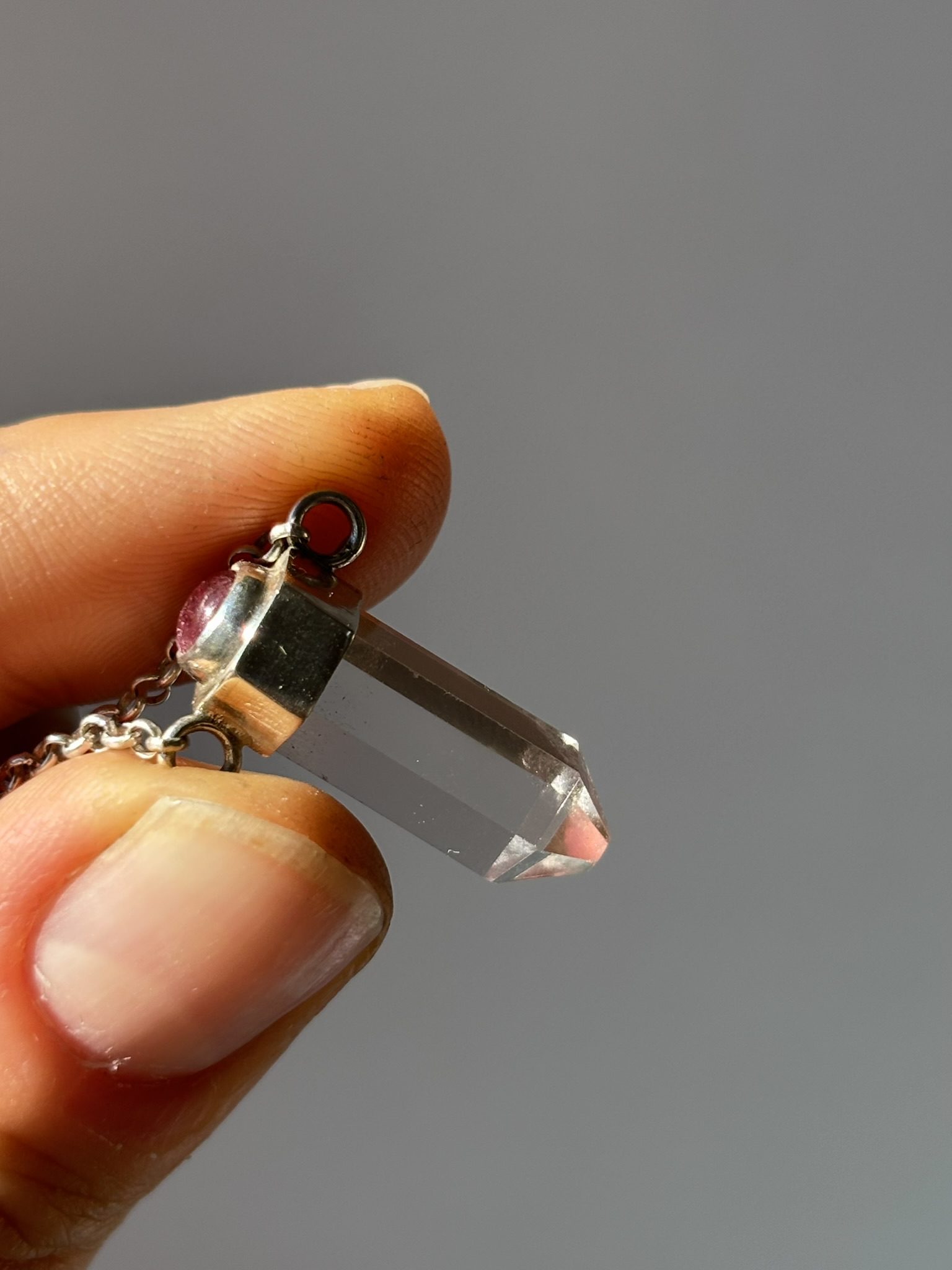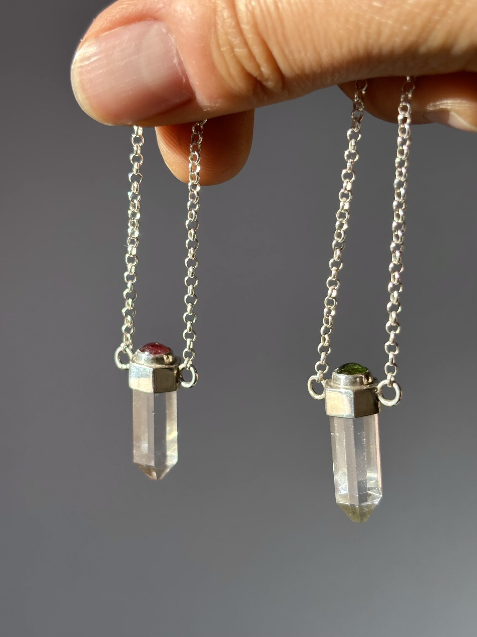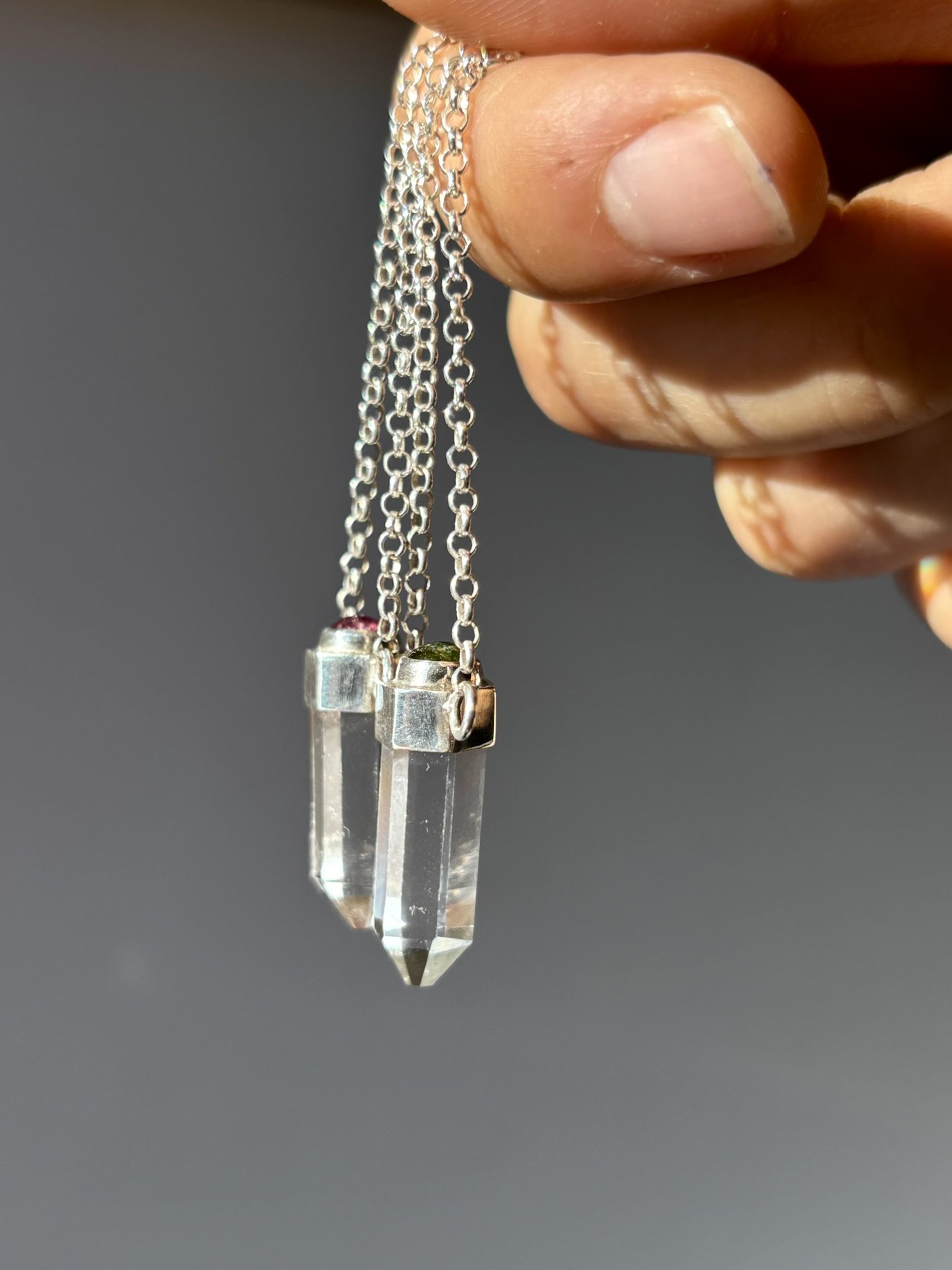 Los péndulos Magia están elaborados artesanalmente con puntas de cuarzo cristal, engaste de turmalinas de colores y plata de ley. Su nombre nace del fascinante efecto de la luz —ya sea natural o artificial— al atravesar la turmalina y reflejarse en el cuarzo, creando un resplandor que parece pura magia.
